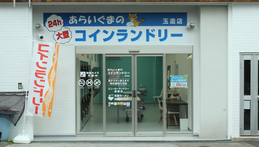 森ノ宮キューズモールから徒歩4分、玉造駅から8分のの距離にある24時間営業のコインランドリー「あらいぐまのコインランドリー」です。森ノ宮キューズモールでの買い物や子どもの習い事のあいまに洗濯、乾燥まで行えます。大型の洗濯乾燥機から小型の物まで、洗濯の量に応じてお選びいただけます。また乾燥機専用機やスニーカー専用のランドリーも設置しています。